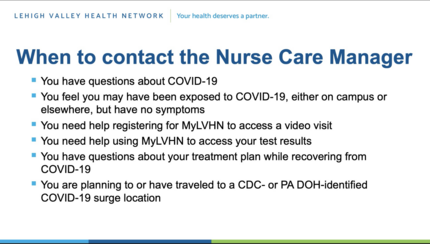 The nurse case manager will facilitate care through recovery and return to work for any employees who suspect exposure or may test positive for COVID-19, working closely with Lehigh Human Resources throughout the process.